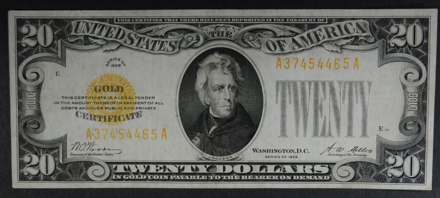 Low number 1928 $20 usa dollars numerical 9 gold demand united states banknote. In very fine condition the value is around $425. The printing is mostly black with gold overprints used for the seal, serial number, and xx. Generally speaking, the 1928 $20 gold certificate is noted for its light pasty seal and a dark green reverse printing. These were the first twenty dollar gold certificates that were ever issued by the united states. Gold certificates and notes in $20, $50, $100 and $1,000 dollar bills. 69 get it as soon as wed, jun 23 The legend gold certificate is printed on the face along with a portrait of andrew jackson. These notes were the new smaller size we all now carry in our pockets. 1907 liberty head $20 gold coin (s) n/a. $20 gold certificates from all other dates are large size bills meaning much larger than the money found in your wallet today. These notes are readily available in all grades and represent a nice place to start collecting paper money. 1863, 1882, 1905, 1906, 1922 & 1928.